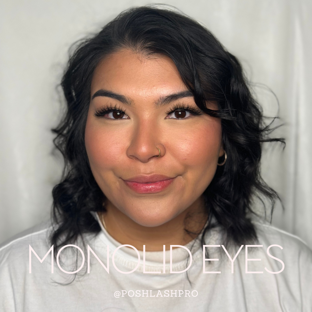 Monolids have no crease in the eyelid or a less obvious one. This eye shape is very common in people of Asian descent. For monolids, we recommend a gentle curl and longer lashes applied at the outer corner. Since most individuals with monolids have a high-set brow, adding a bit of length can beautifully fill the space between the lash line and brow. Posh Lash Pro lashes like Darling, Monroe and Posh are most suitable for this eye shape.